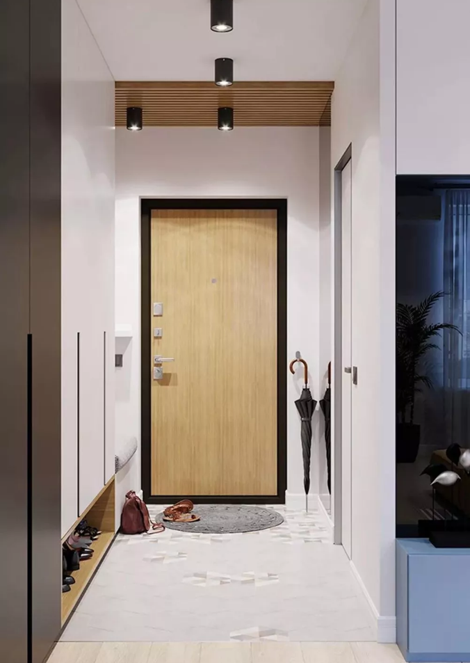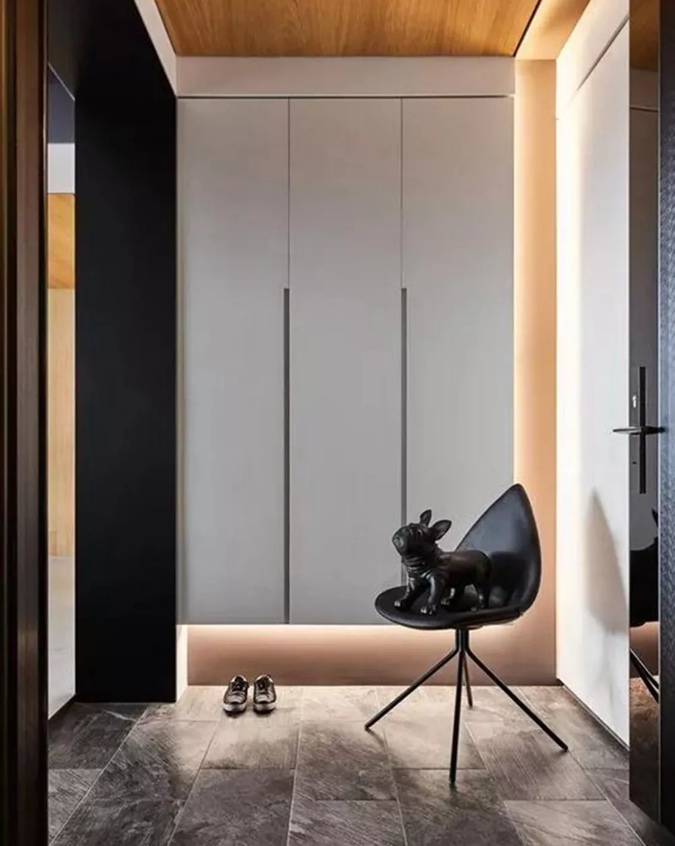 除了底部燈帶,柜子中間留空部分也可以設(shè)燈帶或射燈,打亮上面的裝飾品,或者有時(shí)候在門口簽收快遞、在包里翻找鑰匙時(shí),方便照明。