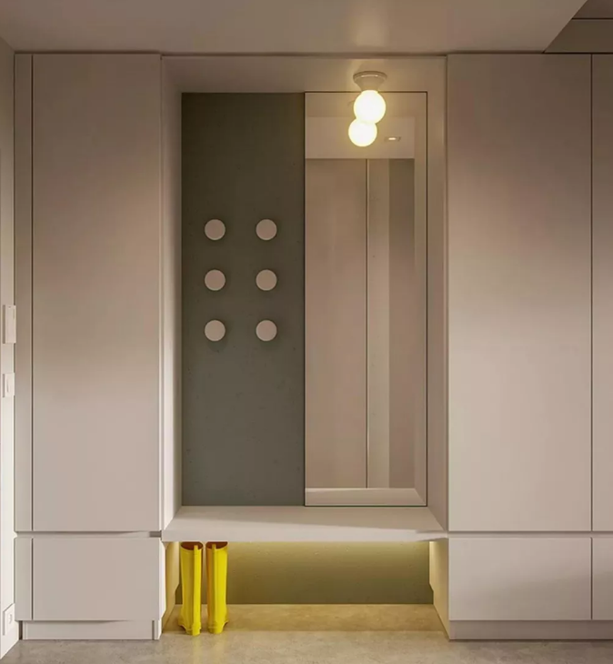鏡子嵌入到墻壁中一直頂?shù)教旎?,有放大空間的效果,換鞋凳上方設(shè)置一些衣帽鉤,方便進(jìn)門時(shí)換下外套掛起來。