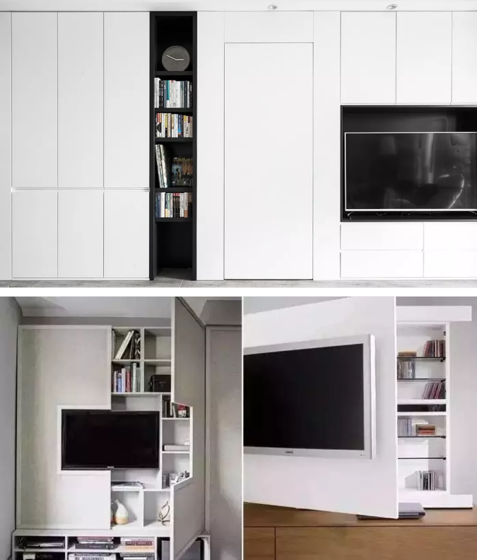 當(dāng)然,想要弱化電視的存在感也很簡(jiǎn)單。時(shí)下流行的隱藏式移門(mén)設(shè)計(jì),就可以巧妙地將它遮擋起來(lái),在不看電視的時(shí)候讓眾多藏書(shū)成為重點(diǎn)。