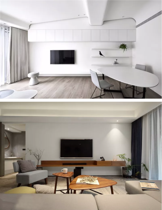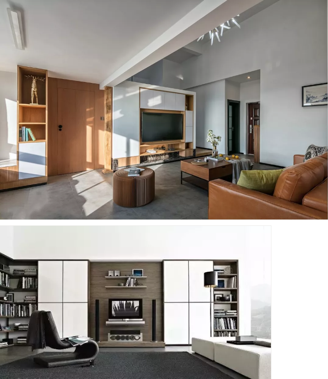 你可以在電視上下采用懸浮式吊柜、嵌入式壁柜、矮柜+吊柜的組合形式將電視包圍起來(lái),不僅大大提高空間利用率,而且看起來(lái)很有層次感,實(shí)用性超強(qiáng)。