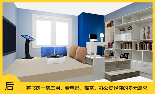 利用臺(tái)階,制造高低層次分區(qū)效果,隔開辦公區(qū)和影音區(qū),增加整體空間感